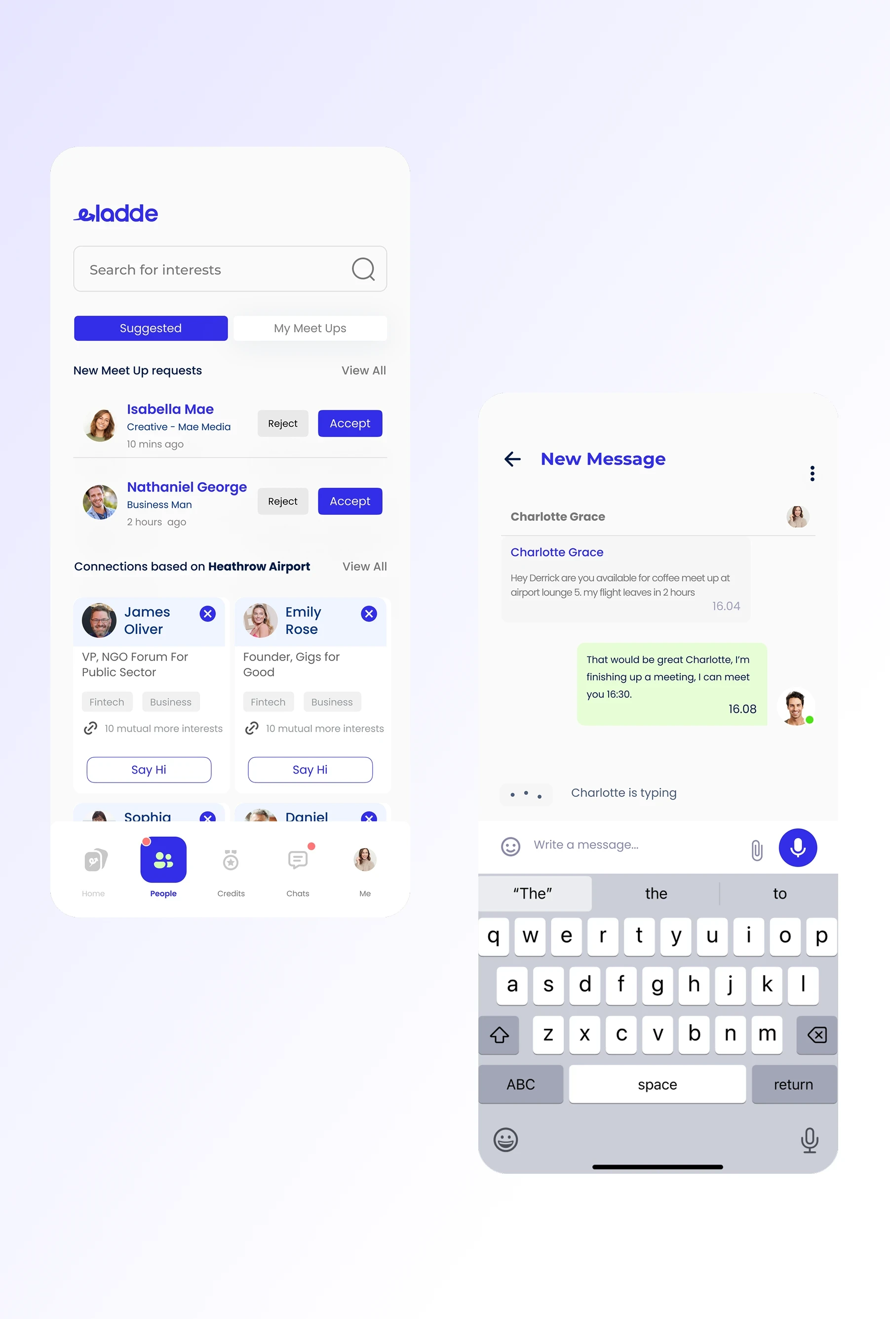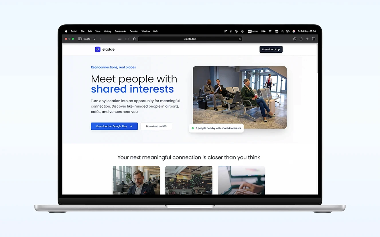 eladde is a location-based social app designed to help people connect in real life whether they’re at an airport, café, hotel, restaurant, lounge, or coworking space. It shows users nearby with similar interests or professional experience, allowing them to: